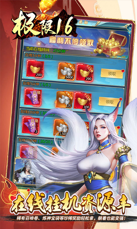 上线福利: 登录即享至尊礼:秒升SVIP10,领万元充值卡,绝版时装与侍神,开局尽享顶级特权! 每日签到福利多:海量材料轻松得,累计指定天数更送圣兽妖魄,助你战力飞升! 七日狂欢大奖送:次日领SR法器,第七天必得SSR圣物,极品装备助力横扫九界! 在线挂机资源丰:稀有召唤卷、炼神宝袋等珍稀奖励轻松拿,躺着也能变强! 首日必得萌猛将:SR食铁兽侍神直送,国宝级伙伴,又萌又猛战力无双!