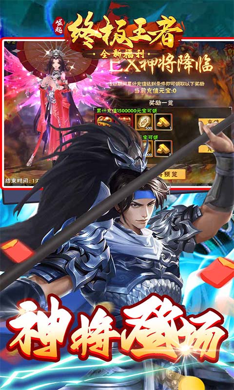 1.开局送800现金点,可直接购买全神将礼包。 2.充值比例1:4000,内置0.1折爽充超值返利。 3.登陆免费送88888元宝、1亿金币、精英招募令*100、328元返利券、648元返利券。 4.登陆激活武圣关羽 5.登陆即享满级GM特权,GM商城全场1元宝购买. 6.新增现金点活动,奖励多多、福利多多!!