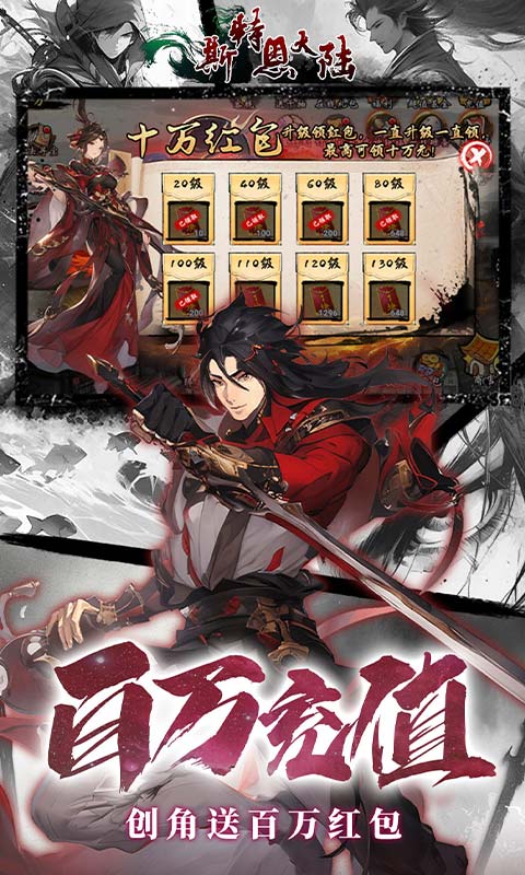 ★【超低折扣】:充值折上折,天天送6480代金劵 ★【闯关福利】:江湖闯关送千抽! ★【上线福利】:创角送百万充值! ★【十万红包】:升级送十万红包! ★【送全图鉴】:签到送全红图鉴! ★【满星侠客】:升级送满星侠客!