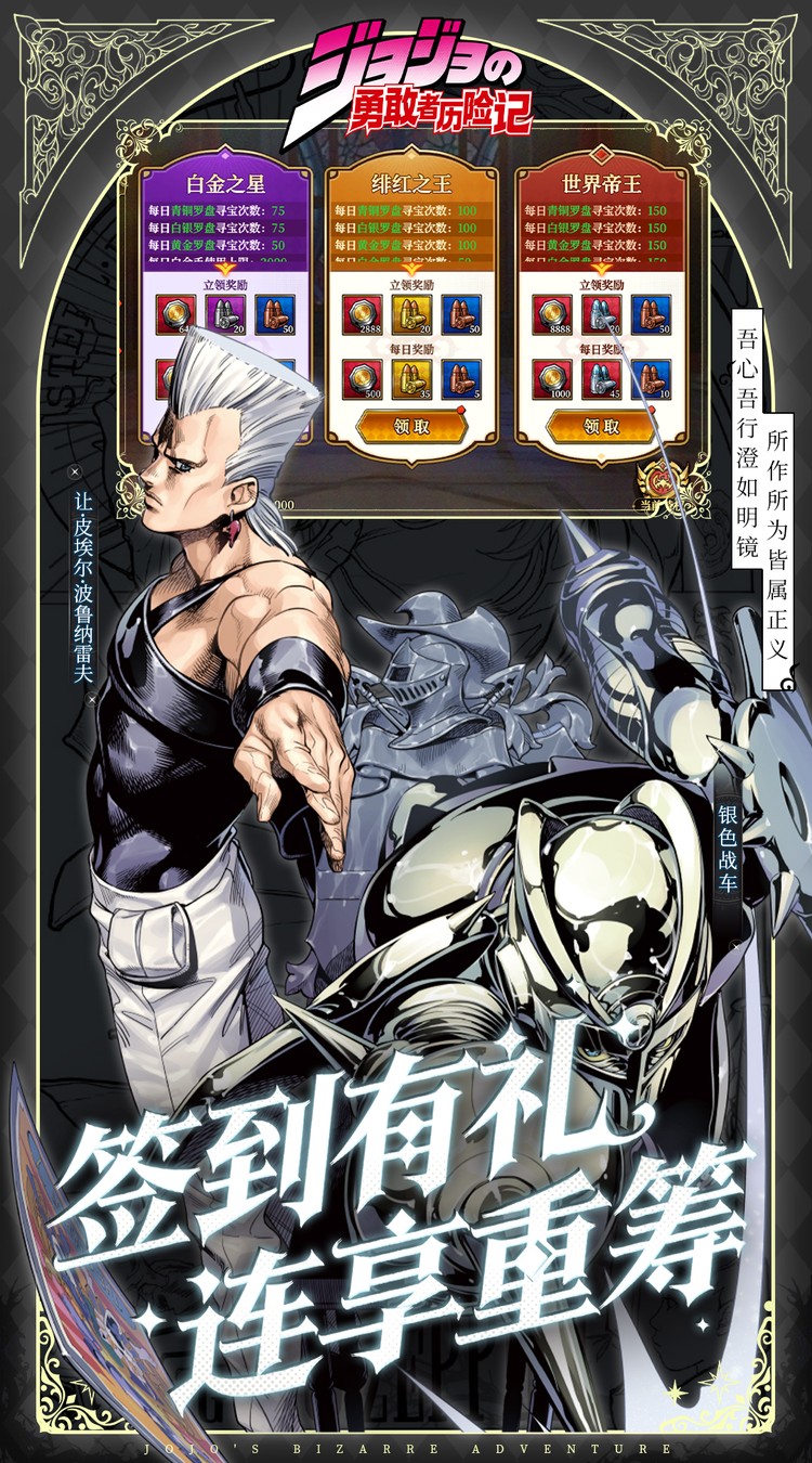 ★【永久0.1折】完美复刻动漫经典场景,全新0.1折版本,绝对真实折扣! ★【创角福利】免费觉醒!开局就送UR英雄-东方仗助,抢占先机,快人一步! ★【七日目标】完成七日目标,东方仗助免费升至觉醒2阶,制霸全服,畅通无阻! ★【八日签到】次日领取SSR英灵-埃及艳后,7日领取648元代金券,8日更有顶级传说装备全套赠送! ★【打金特权】每日命运罗盘抽奖,珍贵资源材料大量产出,无限白嫖! ★【在线奖励】每日在线领取大量钻石+命运罗盘弹头,可用于打金特权抽奖!