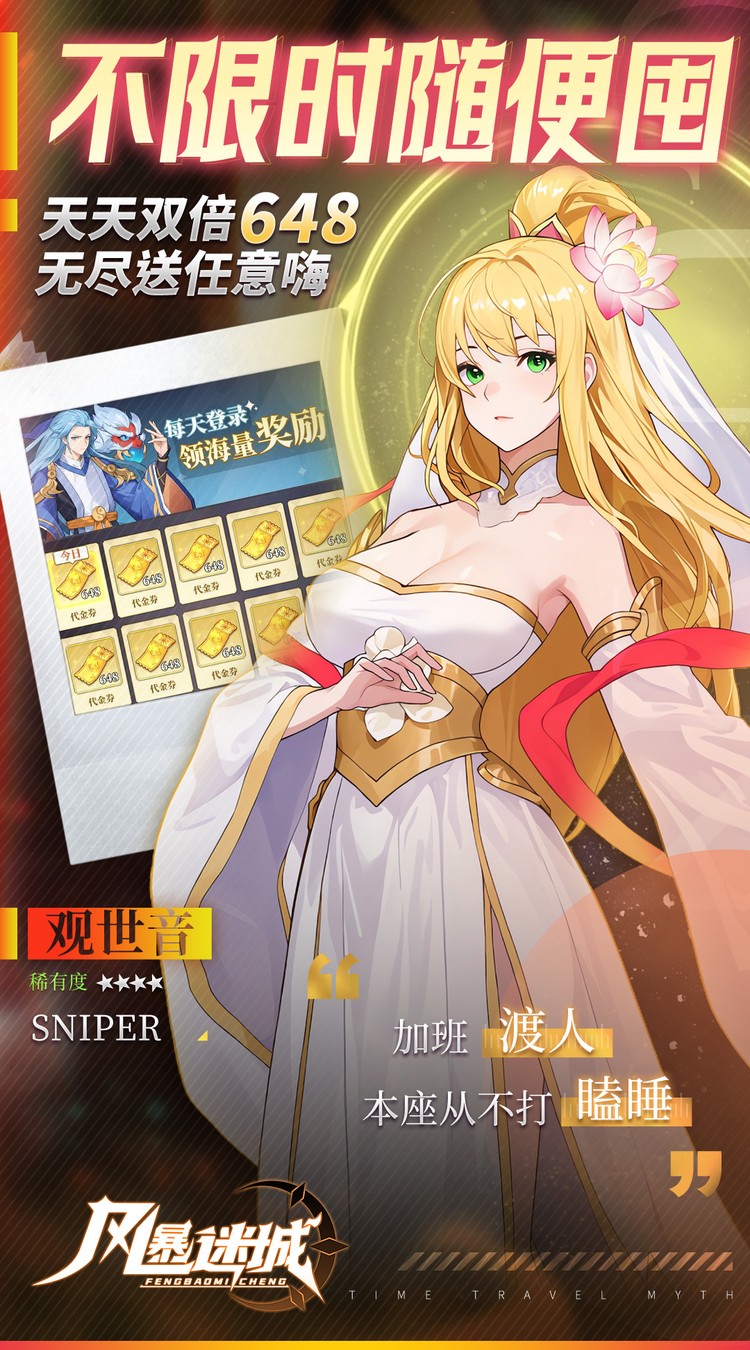 ★【永久0.05折】全新0.05折版本,绝对真实折扣,充值648元仅需3.24元! ★【免费代金】每日免费648元代金券,每天登陆每天有,礼包随便买! ★【创角福利】开局SSR+核心输出“后羿”、绝版称号、万元充值卡,横扫主线就在此刻! ★【八日登录】次日送SSR+核心英雄自选,三日赠送传说装备套装,更有SP神话英雄自选豪礼不断! ★【免费满V】升级即可领取大量奖励和VIP经验,免费直达满V,一步登天! ★【每日签到】每日签到天天送不限时代金券*648! ★【万抽豪礼】天天有得抽,万抽送不停,更有SP神话英雄附加赠送! ★【战力达标】完成达标条件,获取顶级SP神话英雄“哪吒”,轻松制霸全服!