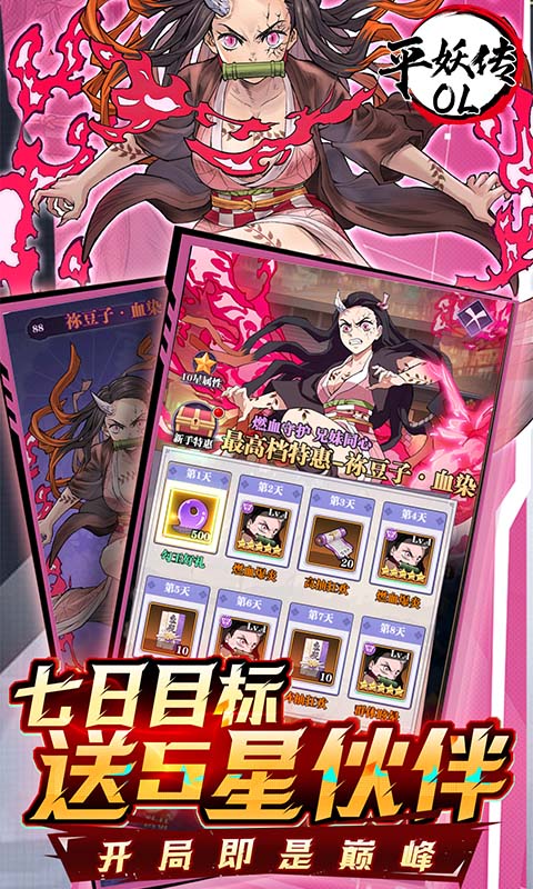 1、七日目标:免费领5星英雄,开局即巅峰! 2、八日签到:祢豆子·血染奉上,并肩作战! 3、每日签到:高级召唤券天天领,欧气不断! 4、首充即赠:炭治郎·神乐入手,一刀封神!