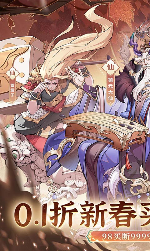 1、全新0.1折98元券买断版开箱上线,每日登录就送6480代金券,签到赠送神话级自选仙侣 2、线上内置低价买断版,仅需98元即可买断999999999代金 3、材料直接送!再无养成焦虑!更有天命特权每天登录尊享专属代金,每天上线元宝领不停! 4、秘宝奇遇抽限定神装称号,鬼斧神工炼自选神宠,海量活动轻松助力全套毕业 5、7倍开箱效率大升级, 超炫法相、坐骑、星图助你轻松寻仙斗法