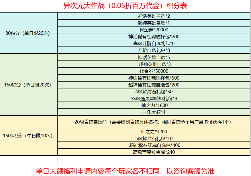 单日实付1元,记为1积分,消耗对应积分,可选择该档位其中一个礼包,可以按照充值金额重复领取(例:单日实付300可以选择两个150积分礼包)